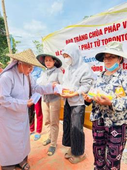 Chúng con đã đi và đến vì tình thương, sự hiện diện của chúng con là sự trao gửi tịnh tài từ Đạo tràng chùa Pháp Vân và Cộng đồng Phật tử Toronto – Canada cùng Hội Đại Bi; đồng thời cũng là sự hiện diện để xoa dịu, an ủi phần nào mất mát quá lớn của đồng bào trong thiên tai. Chúng con đến những ngôi nhà bị sạt lở, có cha đang bị ung thư điều trị tại bệnh viện Đà Nẵng. Chúng con nắm đôi bàn tay của bà cụ ngoài 80 tuổi năn nỉ Sư cô đến thăm nhà mình bị sạt lở, xóa sổ đang phải ở nhờ nhà văn hóa thôn. Chúng con ôm những đứa trẻ miền núi sống trong cảnh không điện, không sóng điện thoại, không đường đi, một lớp học chia làm 2 hướng, xoay lưng vào nhau chia làm nhiều lớp với trình độ cấp Tiểu học. Chúng con đã đi qua sông, nơi thôn Đầu Gò mất trắng ruộng dứa (thơm), đồng bào miền Trung chân chất kiên nhẫn chờ đón đoàn giữa trưa nắng chang chang. Chúng con nhận những cái chắp tay, cúi đầu, và miệng nhỏ nhẹ mở lời “Cảm ơn!”, “A Di Đà Phật”. Chúng con đi thăm từng nhà bị xóa sổ trong cơn bão số 13 Kalmaegi khu vực Sông Cầu, Phú Yên. Những ngôi chùa trong tâm bão lụt 2025 bị thiệt hại rất nhiều. Các chùa chúng con gửi cúng dường đều là ngôi chùa quê, quanh năm cày cấy ruộng lúa làm nguồn thu, Phật tử chùa chân chất, thương vị trụ trì như thương ông Bụt. Đồng bào miền Trung chịu thiệt thòi bởi năm nào cũng gánh vài cơn bão, nhưng năm nay, lũ lụt càng hiểm nguy, thiệt hại về nhà ở, hoa màu hơn mọi năm và trên diện rộng hơn. Chúng con không chỉ mang đến tài chánh giúp đỡ tái thiết sau thiên tai, sự hiện diện, từng cái nắm tay, từng lời động viên đến bà con là nguồn sức mạnh lớn để họ “làm lại từ đầu”.